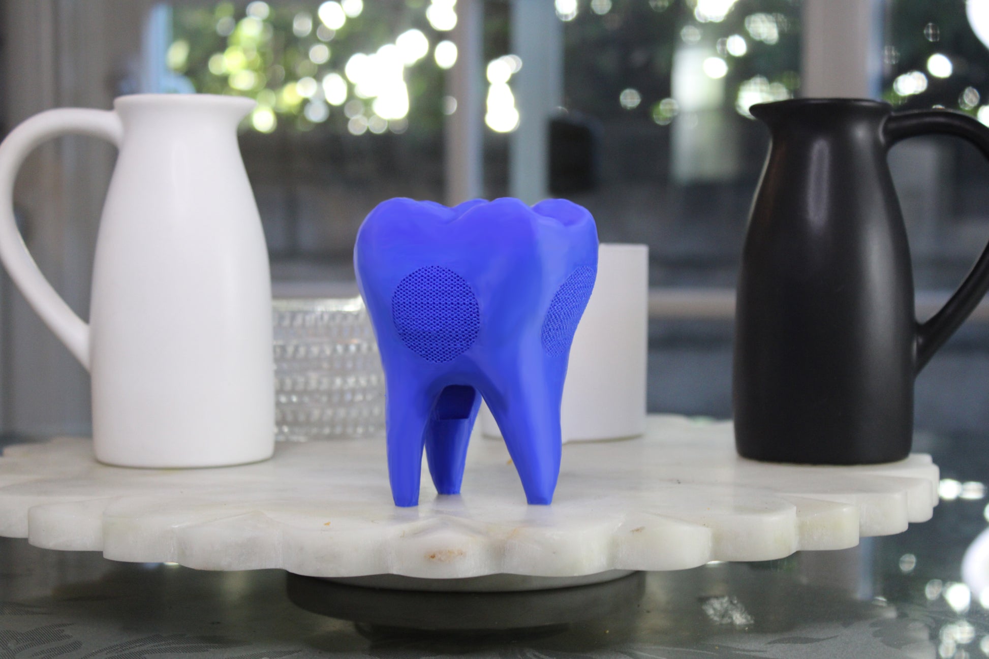Introducing the world's first bluetooth speaker in the shape of a blue tooth. It's: Duh Blue Tooth!